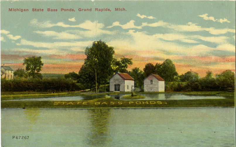 View of the bass ponds and buildings at the State Bass Hatchery in Grand Rapids, Michigan. Printed on front: "Michigan State bass ponds, Grand Rapids, Mich."