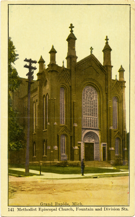 Favorite this☆ Methodist Episcopal church, Grand Rapids, Michigan Description: View of the Methodist Episcopal church in Grand Rapids, Michigan. Printed on front: "141. Methodist Episcopal Church, Fountain and Division Sts., Grand Rapids, Mich." Details Resource ID: bh013976 Subject: Methodist church buildings--Michigan--Grand Rapids Methodist Episcopal Church Postcards Date Issued: Unknown year Format: 1 postcard : col. ; 5.5 x 3.5 in. Member of: Burton Historical Collection Filing Location: M/Localities-Grand Rapids Rights: Physical rights are retained by DPL. Copyright is retained in accordance with U.S. copyright laws.