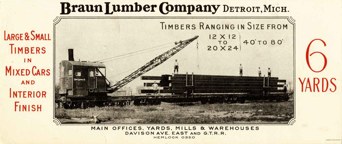 View of an advertising card for the Braun Lumber Company, with a photograph of a crane loading lumber onto a railroad flatcar. Printed on front: "Braun Lumber Company, Detroit, Mich. Large & small timers in mixed cars and interior finish. 6 yards. Timbers ranging in size from 12 x 12 to 20 x 24, 40' to 80'. Main offices, yards, mills & warehouses. Davison Ave., East and G.T.R.R. Hemlock 0320."