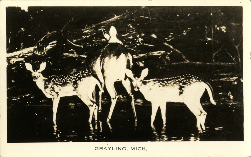 Favorite this☆ Deer, Grayling, Michigan Description: View of deer in Grayling, Michigan. Printed on front: "Grayling, Mich." Label on back: "5. Wild deer in Northern Michigan." Details Resource ID: bh014034 Subject: Deer--Michigan--Grayling Photographic prints Postcards Date Issued: Unknown year Format: 1 postcard ; 3.5 x 5.5 in. Member of: Burton Historical Collection Filing Location: M/Localities-Grayling Rights: Physical rights are retained by DPL. Copyright is retained in accordance with U.S. copyright laws.