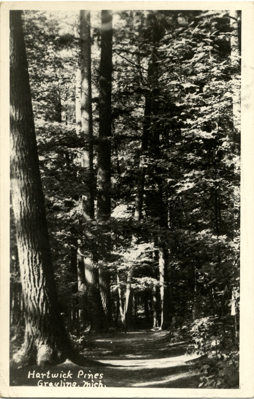 View of Hartwick Pines State Park in Grayling, Michigan. Printed on front: "Hartwick Pines, Grayling, Mich." Handwritten on back: "Dear Georgie, we are safely as far as Grayling. Holding our own well, beautiful trees, wish you could see them. Warm, sunny. Love, Ted." Card is postmarked October 11, 1943.