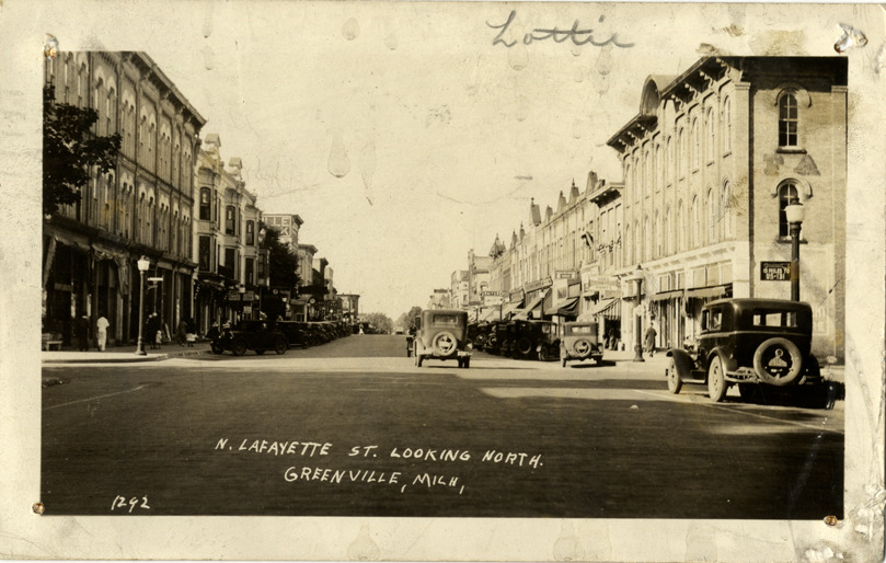 View of cars and commercial buildings on Lafayette St. in Greenville, Michigan. Printed on front: "N. Lafayette St. looking north, Greenville, Mich." Handwritten on front: "Lottie." Handwritten on back: "No. 1 for gallery. Hope everything is going fine with you both. Mrs. Kelpien." Card is postmarked December 13, 1939.