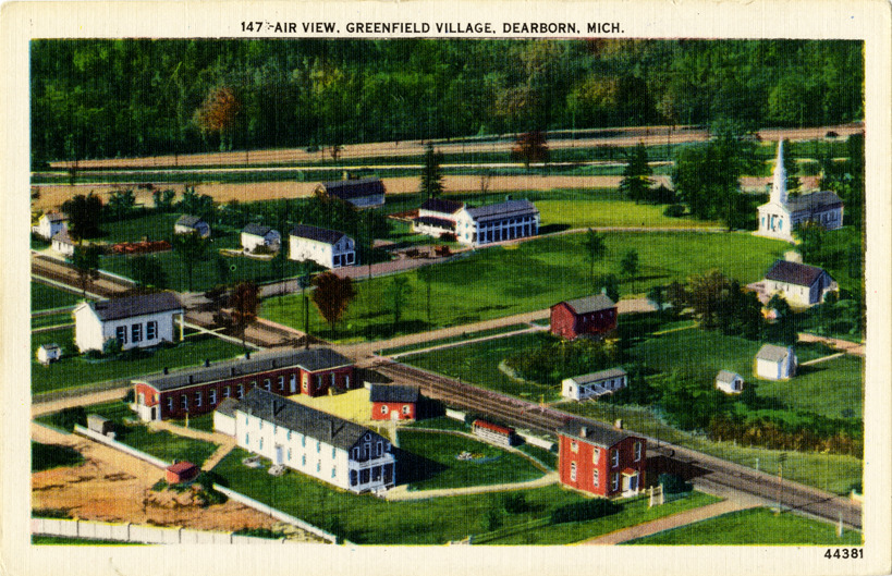 Favorite this☆ Greenfield Village, Dearborn, Michigan Description: Bird's-eye view of Greenfield Village in Dearborn, Michigan. Printed on front: "147. Air view, Greenfield Village, Dearborn, Michigan." Printed on back: "Made by Metropolitan, Everett, Mass." Details Resource ID: bh014074 Subject: Henry Ford Museum and Greenfield Village Postcards Publisher: Metropolitan Metrocraft Date Issued: Unknown year Format: 1 postcard : col. ; 3.5 x 5.5 in. Member of: Burton Historical Collection Filing Location: M/Localities-Greenfield Village Rights: Physical rights are retained by DPL. Copyright is retained in accordance with U.S. copyright laws.
