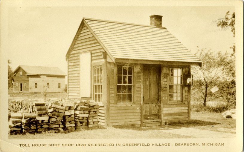 View of the Rocks Village Toll House at Greenfield Village in Dearborn, Michigan. Printed on front: "Toll house shoe shop 1828. Re-erected in Greenfield Village, Dearborn, Michigan" Printed on back: "Artcraft Photo Co., East Rutherford, N.J."