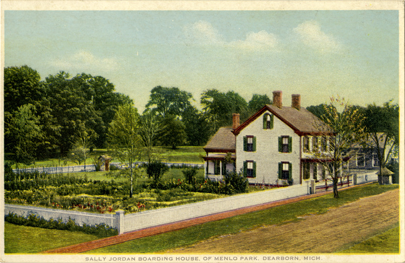 View of the Sarah Jordan Boarding House at Greenfield Village in Dearborn, Michigan. Printed on front: "Sally [sic] Jordan Boarding House of Menlo Park, Dearborn, Mich." Printed on back: "Phostint card. Made only by Detroit Publishing Co., trademark reg. U.S. Pat. Off."