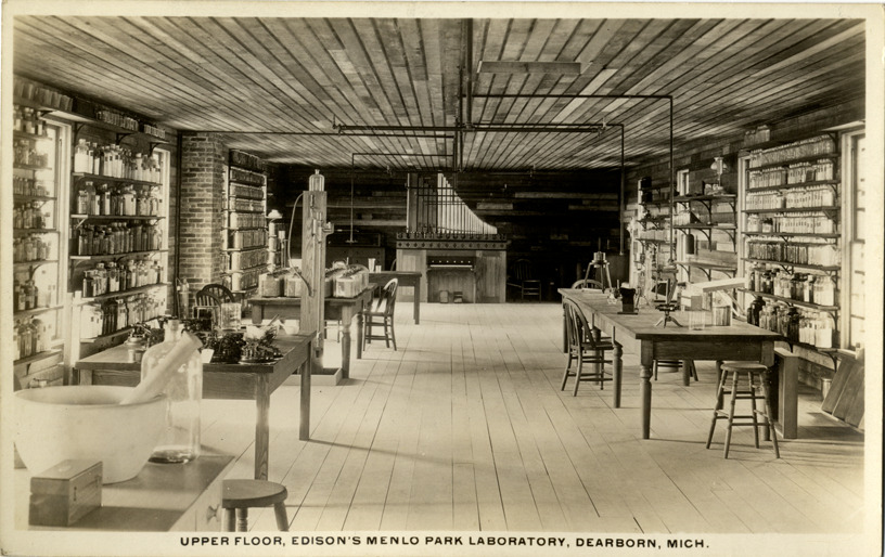 View of the interior of Thomas Edison's Menlo Park Laboratory at Greenfield Village in Dearborn, Michigan. Printed on front: "Upper floor, Edison's Menlo Park Laboratory, Dearborn, Mich."