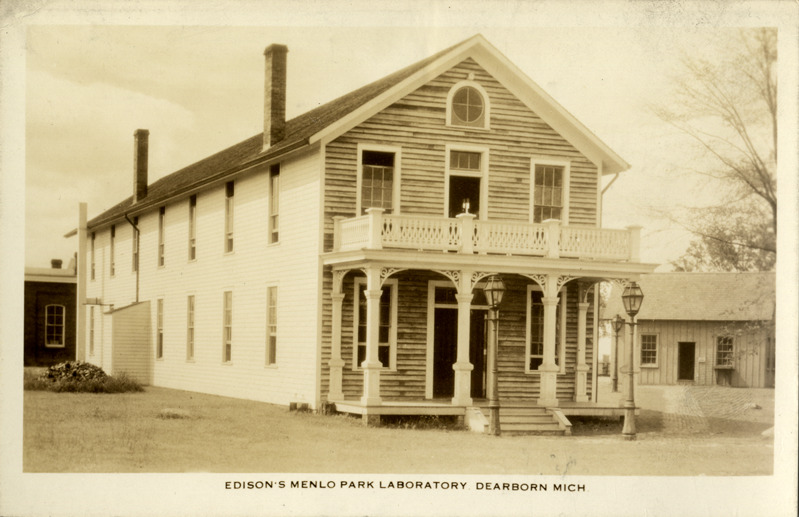 View of Thomas Edison's Menlo Park Laboratory at Greenfield Village in Dearborn, Michigan. Printed on front: "Edison's Menlo Park Laboratory, Dearborn, Mich." Printed on back: "Artcraft Photo Co., East Rutherford, N.J."