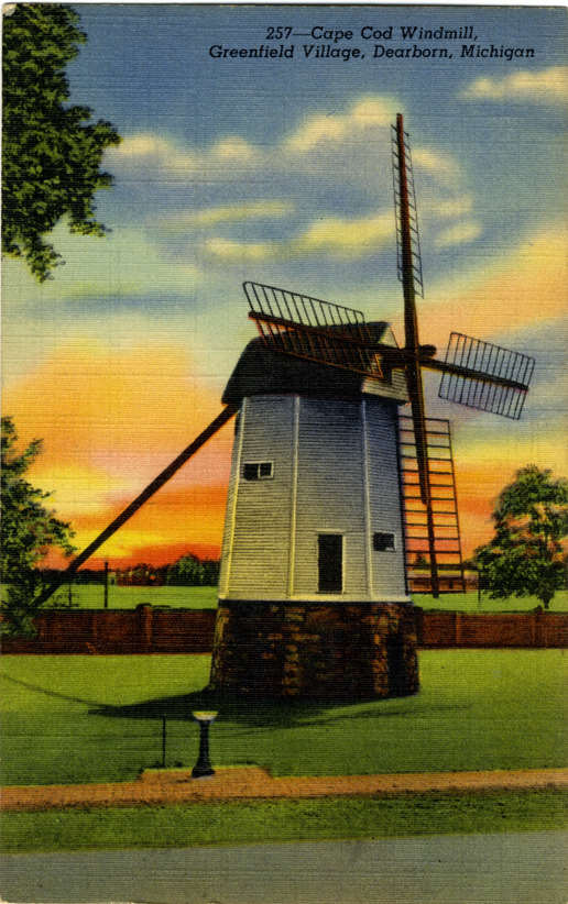 View of the Farris Windmill at Greenfield Village in Dearborn, Michigan. Printed on front: "257. Cape Cod Windmill, Greenfield Village, Dearborn, Michigan." Printed on back: "This is the oldest mill in Greenfield Village, and one of the oldest in the United States to be preserved. It was brought to the village from Cape Cod, and presented to Mr. Henry Ford and Mr. Edsel Ford by the Ford dealers of America. Now restored to its original state, the mill was erected in 1633 near Barnstable on the north side of Cape Cod for the purpose of grinding corn. United News Co., 24 West Jefferson Avenue, Detroit, Mich. Genuine Curteich-Chicago 'C.T. Art-Colortone' post card (reg. U.S. Pat. Off.)"