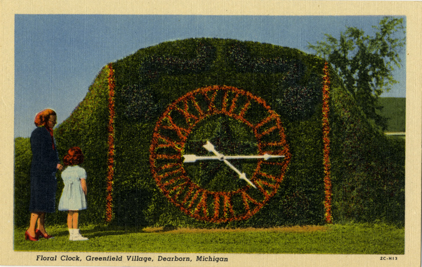 View of a woman and girl looking at floral clock at Greenfield Village in Dearborn, Michigan. Printed on front: "Floral clock, Greenfield Village, Dearborn, Michigan." Printed on back: "Once a familiar landmark in Detroit, this unique timepiece is one of the most popular attractions in Greenfield Village. The face is made of more than 9,000 plants arranged to form the design of the numerals and dial. It was originally powered by drops of water hitting a paddlewheel at measured intervals. Published exclusively for the Henry Ford Museum and Greenfield Village, Dearborn, Michigan. Genuine Curteich-Chicago 'C.T. Art-Colortone' post card (reg. U.S. Pat. Off.)"