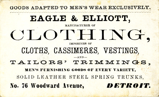 View of a business card for Eagle & Elliott. Printed on front: "Eagle & Elliott, manufacturer of clothing. Importers of cloths, cassimeres, vestings and tailors' trimmings, men's furnishing goods of every variety, solid leather steel spring trunks. No. 76 Woodward Avenue, Detroit. Goods adapted to men's wear exclusively."