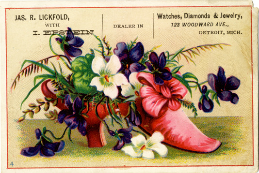 Favorite this☆ Business card for I. Epstein Description: View of a business card for I. Epstein depicting flowers in a shoe. Printed on front: "Jas. R. Lickfold with I. Epstein. Dealer in watches, diamonds & jewelry. 123 Woodward Ave., Detroit, Mich." Details Resource ID: bh014133 Subject: Jewelers--Michigan--Detroit Shoes in art Flowers in art Business cards Date Issued: Unknown year Format: 1 business card : col. ; 2.5 x 3.5 in. Member of: Burton Historical Collection Filing Location: E&M 977.4D4 381 E Rights: Physical rights are retained by DPL. Copyright is retained in accordance with U.S. copyright laws.