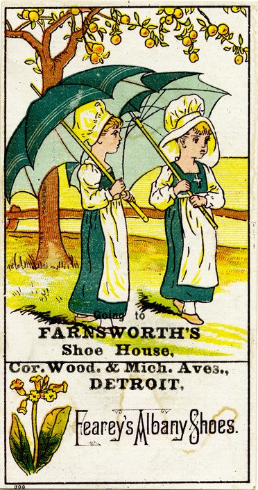 View of an advertising card for Farnsworth's Shoe House, advertising Fearey's Albany shoes. Two girls holding umbrellas are depicted on front. Printed on front: "Going to Farnsworth's Shoe House, cor. Wood. & Mich. Aves., Detroit. Fearey's Albany shoes."