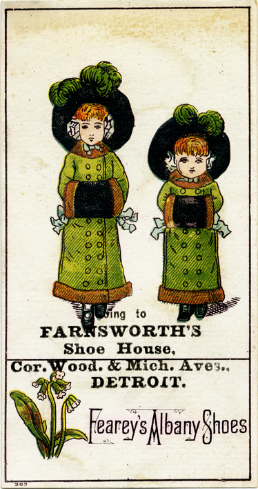View of an advertising card for Farnsworth's Shoe House, advertising Fearey's Albany shoes. Two girls holding muffs are depicted on front. Printed on front: "Going to Farnsworth's Shoe House, cor. Wood. & Mich. Aves., Detroit. Fearey's Albany shoes."