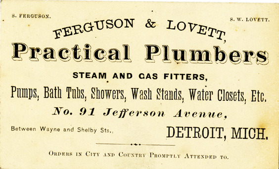 View of a business card for Ferguson & Lovett. Printed on front: "Ferguson & Lovett, practical plumbers, steam and gas fitters, pumps, bath tubs, showers, wash stands, water closets, etc. No. 91 Jefferson Avenue, between Wayne and Shelby Sts., Detroit, Mich. S. Ferguson. S.W. Lovett. Orders in city and country promptly attended to."