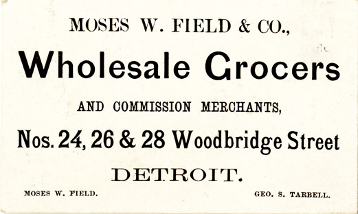 Favorite this☆ Business card for Moses W. Field & Co. Description: View of a business card for Moses W. Field & Co. Printed on front: "Moses W. Field & Co., wholesale grocers and commission merchants, Nos. 24, 26 & 28 Woodbridge Street, Detroit. Moses W. Field, Geo. S. Tarbell." Details Resource ID: bh014201 Subject: Grocery trade--Michigan--Detroit Grocers--Michigan--Detroit Business cards Date Issued: Unknown year Format: 1 business card ; 2 x 3.5 in. Member of: Burton Historical Collection Filing Location: E&M 977.4D4 381 F Rights: Physical rights are retained by DPL. Copyright is retained in accordance with U.S. copyright laws.