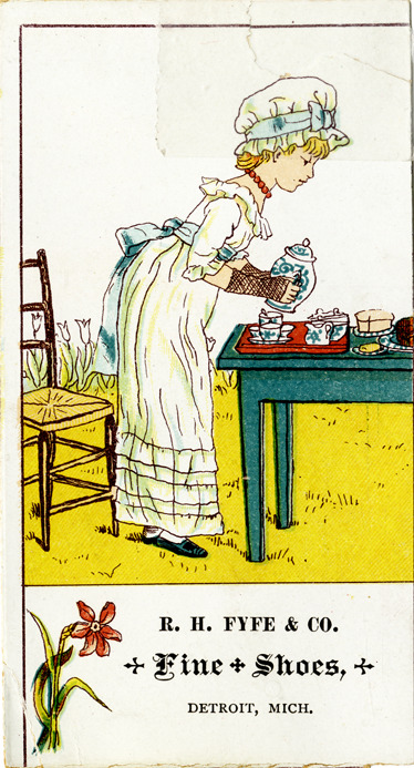 Favorite this☆ Advertising card for R.H. Fyfe & Co. Description: View of an advertising card for R.H. Fyfe & Co., depicting a girl making tea. Printed on front: "R.H. Fyfe & Co. fine shoes, Detroit, Mich." Details Resource ID: bh014226 Subject: Shoe stores--Michigan--Detroit Girls in art Tea making paraphernalia in art Advertising--Shoes Advertising cards Date Issued: Unknown year Format: 1 advertising card : col. ; 4.75 x 2.5 in. Member of: Burton Historical Collection Filing Location: E&M 977.4D4 381 F99 Rights: Physical rights are retained by DPL. Copyright is retained in accordance with U.S. copyright laws.
