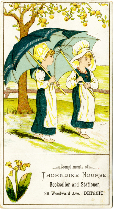 Favorite this☆ Advertising card for Thorndike Nourse Description: View of an advertising card for Thorndike Nourse, depicting two girls holding umbrellas. Printed on front: "Compliments of Thorndike Nourse, bookseller and stationer, 86 Woodward Ave., Detroit." Details Resource ID: bh014229 Subject: Stationers--Michigan--Detroit Booksellers and bookselling--Michigan--Detroit Girls in art Umbrellas in art Advertising cards Date Issued: Unknown year Format: 1 advertising card : col. ; 4.75 x 2.5 in. Member of: Burton Historical Collection Filing Location: E&M 977.4D4 381 T Rights: Physical rights are retained by DPL. Copyright is retained in accordance with U.S. copyright laws.