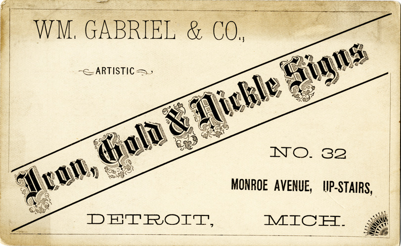 View of a business card for Wm. Gabriel & Co. Printed on front: "Wm. Gabriel & co., artistic. Iron, gold & nickle signs. No. 32 Monroe Avenue, up-stairs, Detroit, Mich."