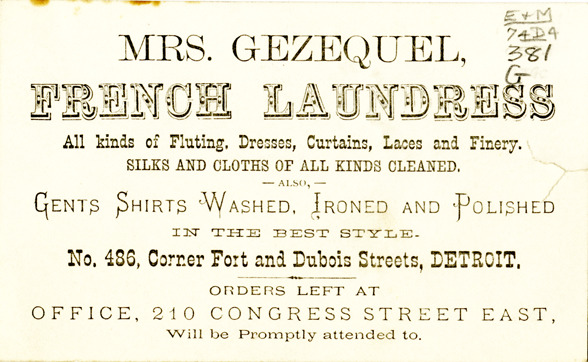 View of a business card for Mrs. Gezequel. Printed on front: "Mrs. Gezequel, French laundress. All kinds of fluting, dresses, curtains, laces and finery. Silks and cloths of all kinds cleaned. Also, gents shirts washed, ironed and polished in the best style. No. 486, corner Fort and Dubois Streets, Detroit. Orders left at Office, 210 Congress Street East, will be promptly attended to."
