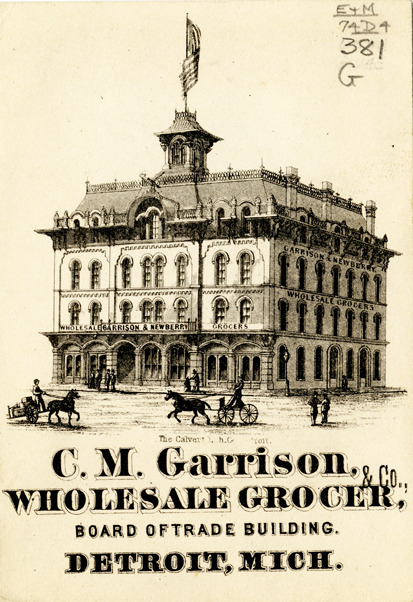 Favorite this☆ Business card for C.M. Garrison & Co. Description: View of a business card for C.M. Garrison & Co., depicting Italianate building. Printed on front: "C.M. Garrison & Co., wholesale grocer, Board of Trade building. Detroit, Mich. The Calvert Lith Co., Detroit." Details Resource ID: bh014253 Creator: Calvert Lithographing Co. (Detroit, Mich.) Subject: Grocery trade--Michigan--Detroit Grocers--Michigan--Detroit Buildings in art Business cards Date Issued: Unknown year Format: 1 business card ; 4 x 2.75 in. Member of: Burton Historical Collection Filing Location: E&M 977.4D4 381 G Rights: Physical rights are retained by DPL. Copyright is retained in accordance with U.S. copyright laws.