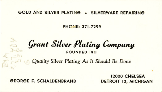 View of a business card for Grant Silver Plating Company. Printed on front: "Grant Silver Plating Company, founded 1911. Quality silver plating as it should be done. Gold and silver plating, silverware repairing. George F. Schaldenbrand, 12000 Chelsea, Detroit 13, Michigan."