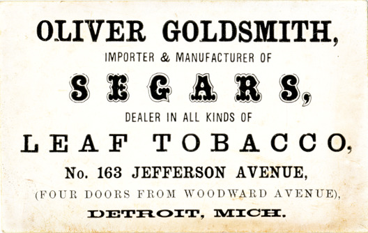 Favorite this☆ Business card for Oliver Goldsmith Description: Business card for Oliver Goldsmith. Printed on front: "Oliver Goldsmith, importer & manufacturer of segars, dealer in all kinds of leaf tobacco. No. 163 Jefferson Avenue, four doors from Woodward Avenue, Detroit, Mich." Details Resource ID: bh014263 Subject: Cigar manufacture and trade--Michigan--Detroit Business cards Date Issued: Unknown year Format: 1 business card ; 2.25 x 3.5 in. Member of: Burton Historical Collection Filing Location: E&M 977.4D4 381 G Rights: Physical rights are retained by DPL. Copyright is retained in accordance with U.S. copyright laws.