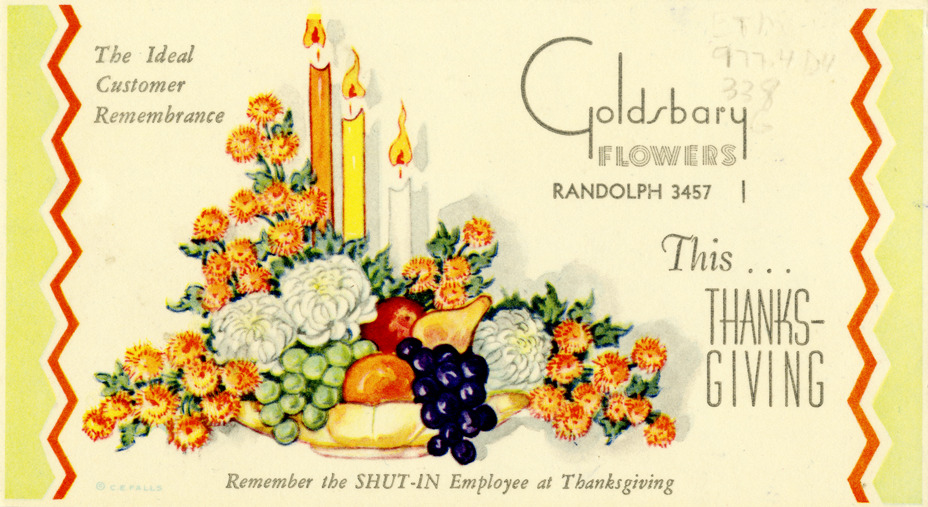 View of an advertising card for Goldsbary Flowers, depicting a centerpiece with fruit, flowers and candles. Printed on front: "Goldsbary Flowers this Thanksgiving. Randolph 3457. The ideal customer remembrance. Remember the shut-in employee at Thanksgiving. C.E. Falls."