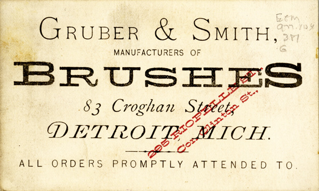 Favorite this☆ Business card for Gruber & Smith Description: View of a business card for Gruber & Smith. Printed on front: "Gruber & Smith, manufacturers of brushes. 83 Croghan Street, Detroit, Mich. All orders promptly attended to." Stamped on front: "295 Riopelle St., cor. Clinton St." Details Resource ID: bh014286 Subject: Brooms and brush industry--Michigan--Detroit Business cards Date Issued: Unknown year Format: 1 business card ; 2.5 x 4.25 in. Member of: Burton Historical Collection Filing Location: E&M 977.4D4 381 G Rights: Physical rights are retained by DPL. Copyright is retained in accordance with U.S. copyright laws.