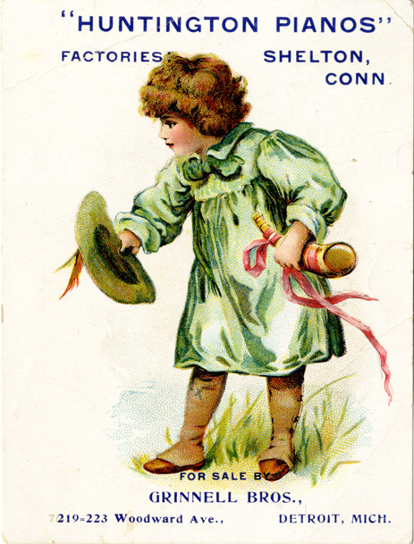 View of an advertising card for Grinnell Bros., advertising Huntington pianos. Card depicts a young girl holding a horn and a hat. Printed on front: "Huntington pianos. Factories, Shelton, Conn. For sale by Grinnell Bros., 219-223 Woodward Ave., Detroit, Mich."