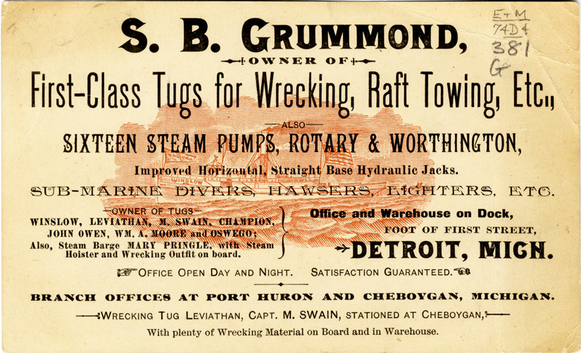 View of an advertising card for S.B. Grummond. Printed on front: "S.B. Grummond, owner of first-class tugs for wrecking, raft towing, etc., sixteen steam pumps, rotary & Worthington, improved horizontal, straight base hydraulic jacks. Sub-marine divers, hawsers, lighters, etc. Office and warehouse on dock, foot of First Street, Detroit, Mich. Owner of tugs Winslow, Leviathan, M. Swain, Champion, John Owen, Wm. A. Moore and Oswego. Also steam barge Mary Pringle, with steam hoister and wrecking outfit on board. Office open day and night. Satisfaction guaranteed. Branch offices at Port Huron and Cheboygan, Michigan. Wrecking tug Leviathan, Capt. M. Swain, stationed at Cheboygan, with plenty of wrecking material on board in in warehouse."