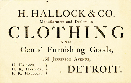 View of a business card for H. Hallock & Co. Printed on front: "H. Hallock & Co. Manufacturers and dealers in clothing and gents' furnishing goods, 168 Jefferson Avenue, Detroit. H. Hallock, H.R. Hallock, F.R. Hallock."