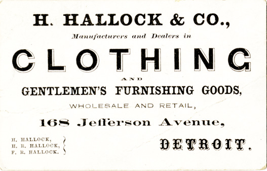 Favorite this☆ Business card for H. Hallock & Co. Description: Business card for H. Hallock & Co. Printed on front: "H. Hallock & Co. Manufacturers and dealers in clothing and gentlemen's furnishing goods, wholesale and retail, 168 Jefferson Avenue, Detroit. H. Hallock, H.R. Hallock, F.R. Hallock." Details Resource ID: bh014312 Subject: Clothing trade--Michigan--Detroit Men's furnishing goods--Michigan--Detroit Business cards Date Issued: Unknown year Format: 1 business card ; 2.25 x 3.5 in. Member of: Burton Historical Collection Filing Location: E&M 977.4D4 381 H Rights: Physical rights are retained by DPL. Copyright is retained in accordance with U.S. copyright laws.