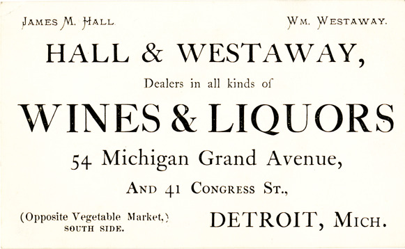 View of a business card for Hall & Westaway. Printed on front: "Hall & Westaway, dealers in all kinds of wines & liquors. 54 Michigan Grand Avenue, and 41 Congress St., Detroit, Mich. Opposite vegetable market, south side. James M. Hall, Wm. W. Westaway."