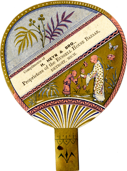 Favorite this☆ Advertising card for H. Heyn & Bro. Description: View of an advertising card for H. Heyn & Bro., in the shape of a fan with a Chinese motif. Printed on front: "Compliments of H. Heyn & Bro., proprietors of the Russell House Bazaar, Detroit, Mich." Details Resource ID: bh014335 Subject: Stores, Retail--Michigan--Detroit Fans Advertising cards Date Issued: Unknown year Format: 1 advertising card : col. ; 5 x 3.5 in. Member of: Burton Historical Collection Filing Location: E&M 977.4D4 381 H Rights: Physical rights are retained by DPL. Copyright is retained in accordance with U.S. copyright laws.