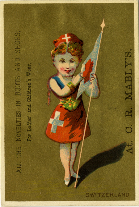 Favorite this☆ Advertising card for C.R. Mabley Description: View of an advertising card for C.R. Mabley, depicting a woman wearing costume of Switzerland. Printed on front: "All the novelties in boots and shoes, for ladies' and children's wear at C.R. Mably's [sic]. Switzerland." Details Resource ID: bh014426 Subject: Department stores--Michigan--Detroit Advertising--Clothing and dress Women in advertising Clothing and dress in art Advertising cards Date Issued: Unknown year Format: 1 advertising card : col. ; 4.5 x 3 in. Member of: Burton Historical Collection Filing Location: E&M 977.4D4 381 M11 Rights: Physical rights are retained by DPL. Copyright is retained in accordance with U.S. copyright laws.