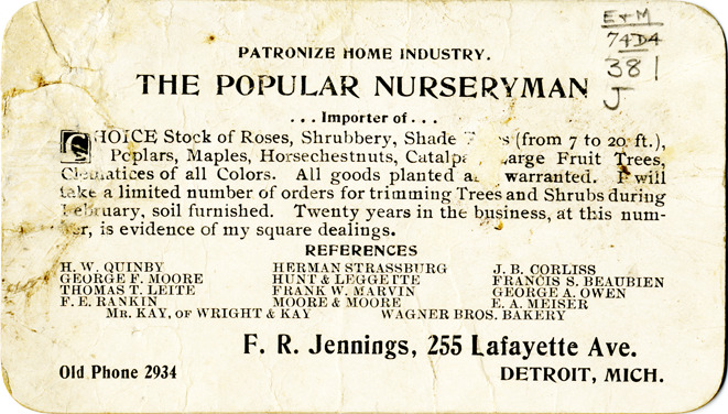 View of a business card for F.R. Jennings. Printed on front: "F.R. Jennings, 255 Lafayette Ave., Detroit, Mich. Old phone 2934. Patronize home industry. The popular nurseryman, importer of choice stock of roses, shrubbery, shade trees (from 7 to 20 ft.), poplars, maples, horsechestnuts, catalpas, large fruit trees, clematices of all colors. All goods planted and warranted. I will take a limited number of orders for trimming trees and shrubs during February, soil furnished. Twenty years in the business, at this number, is evidence of my square dealings." Includes list of references.