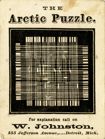 Favorite this☆ Advertising card for W. Johnston Description: View of an advertising card for W. Johnston, depicting a puzzle. Printed on front: "The Arctic puzzle. For explanation call on W. Johnston, 155 Jefferson Avenue, Detroit, Mich." Details Resource ID: bh014444 Subject: Pharmacists--Michigan--Detroit Drugstores--Michigan--Detroit Puzzles Advertising cards Date Issued: Unknown year Format: 1 advertising card ; 3.25 x 2.5 in. Member of: Burton Historical Collection Filing Location: E&M 977.4D4 381 J Rights: Physical rights are retained by DPL. Copyright is retained in accordance with U.S. copyright laws.