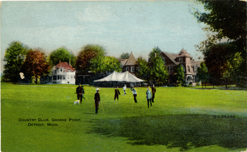 View of men on the grounds of the country club in Grosse Pointe, Michigan. Buildings and tent in background. Printed on front: "Country Club, Grosse Point [sic], Detroit, Mich." Printed on back: "The Rotograph Co., N.Y., City."