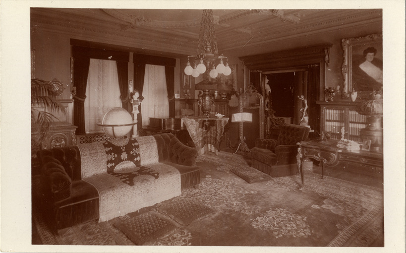 View of the living room in Ridgemont, the residence of David C. Whitney, in Grosse Pointe, Michigan. Room is furnished with sofa, chairs, globe, tables, artwork and bookshelves. Handwritten on back: "Whitney house, Grosse Pointe, Mich."
