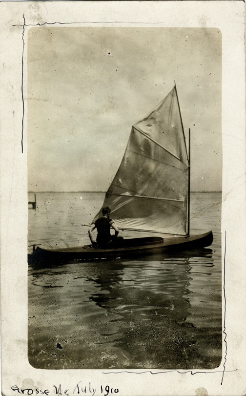 Favorite this☆ Man in sailboat, Grosse Ile, Michigan Description: View of a man in a sailboat at Grosse Ile, Michigan. Handwritten on front: "Grosse Ile, July 1910." Handwritten on back: "1910." Details Resource ID: bh014486 Subject: Sailboats--Michigan--Grosse Ile Photographic prints Postcards Date Issued: 1910-07 Format: 1 postcard ; 5.5 x 3.5 in. Member of: Burton Historical Collection Filing Location: M/Localities-Grosse Ile Rights: Physical rights are retained by DPL. Copyright is retained in accordance with U.S. copyright laws.