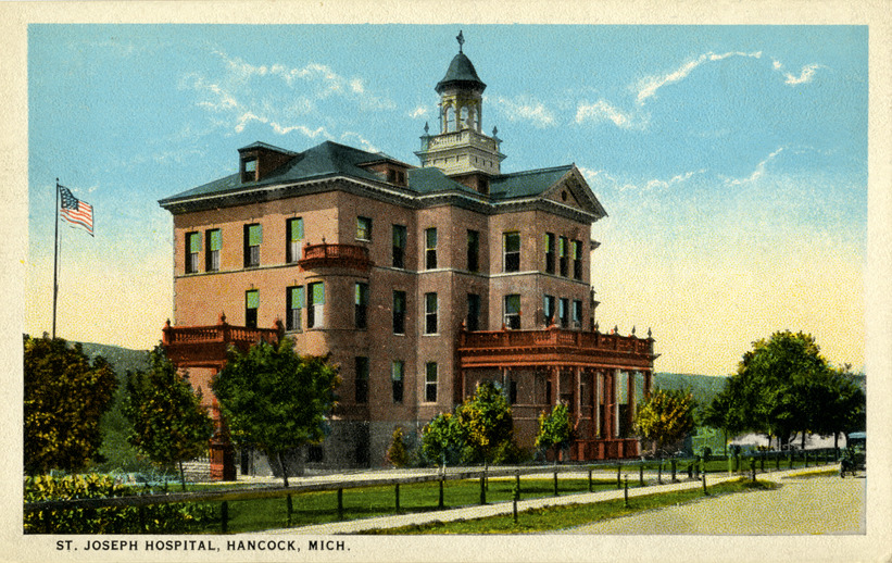 Favorite this☆ St. Joseph Hospital, Hancock, Michigan Description: View of St. Joseph Hospital in Hancock, Michigan. Printed on front: "St. Joseph Hospital, Hancock, Mich." Printed on back: "Published by C.A. Silfven Studio, Hancock, Mich. C.T. American Art." Details Resource ID: bh014499 Subject: Hospital buildings--Michigan--Hancock Postcards Publisher: C.A. Silfven Studio Curt Teich & Co. Date Issued: Unknown year Format: 1 postcard : col. ; 3.5 x 5.5 in. Member of: Burton Historical Collection Filing Location: M/Localities-Hancock Rights: Physical rights are retained by DPL. Copyright is retained in accordance with U.S. copyright laws.
