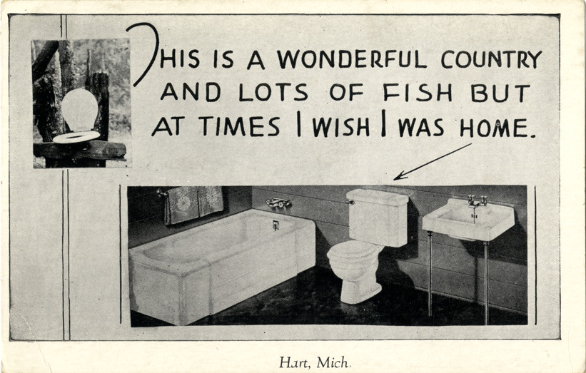 View of toilet seat balanced on a log, and a bathroom, with toilet, sink and bathtub. Printed on front: "This is a wonderful country and lots of fish but at times I wish I was home. Hart, Mich." Printed on back: "Charles J. Herbert, Traverse City, Mich."