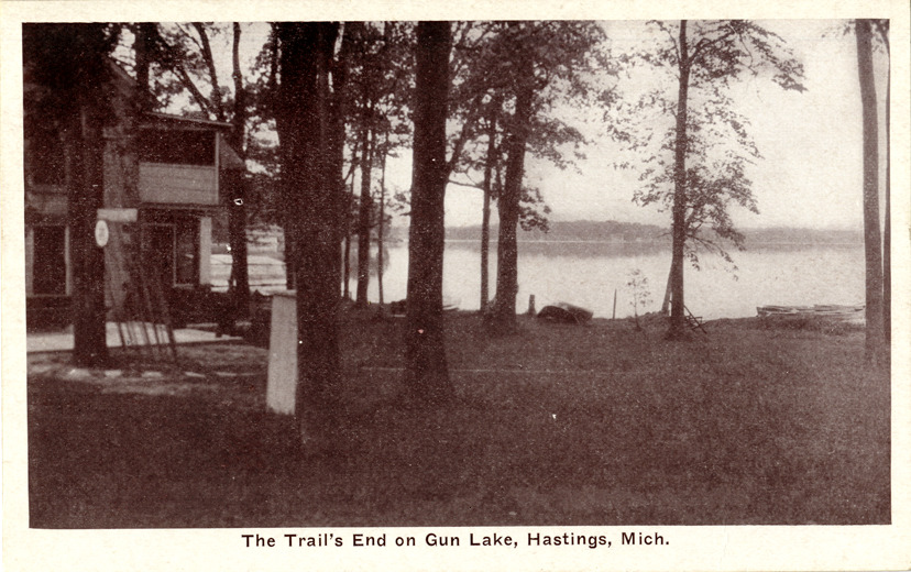 Favorite this☆ Gun Lake, Hastings, Michigan Description: View of Gun Lake in Hastings, Michigan. Dwelling is partially visible through trees on left. Printed on front: "The trail's end on Gun Lake, Hastings, Mich." Printed on back: "Auburn Greeting Card Co., Auburn, Ind." Details Resource ID: bh014589 Subject: Lakes--Michigan--Hastings Postcards Publisher: Auburn Greeting Card Co. Date Issued: Unknown year Format: 1 postcard ; 3.5 x 5.5 in. Member of: Burton Historical Collection Filing Location: M/Localities-Hastings Rights: Physical rights are retained by DPL. Copyright is retained in accordance with U.S. copyright laws.
