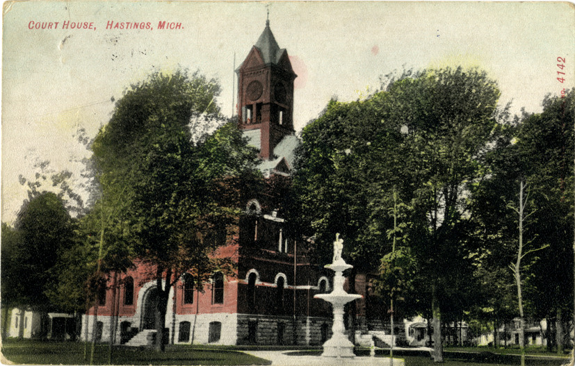 Favorite this☆ Courthouse, Hastings, Michigan Description: View of the courthouse in Hastings, Michigan. Fountain in foreground. Printed on front: "Court house, Hastings, Mich. No. 4142." Handwritten on back: "Just arrived. I am going out with a homely girl tonight. Bruce." Details Resource ID: bh014597 Subject: Courthouses--Michigan--Hastings Fountains--Michigan--Hastings Postcards Date Issued: Unknown year Format: 1 postcard : col. ; 3.5 x 5.5 in. Member of: Burton Historical Collection Filing Location: M/Localities-Hastings Rights: Physical rights are retained by DPL. Copyright is retained in accordance with U.S. copyright laws.