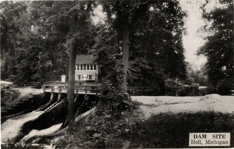 Favorite this☆ Dam, Hell, Michigan Description: View of the dam at Hell, Michigan. Printed on front: "Dam site, Hell, Michigan." Printed on back: "Published by G.C. O'Neil. 6088 Auburn, Detroit 28, Mich." Details Resource ID: bh014600 Subject: Dams--Michigan--Hell Postcards Date Issued: Unknown year Format: 1 postcard ; 3.5 x 5.5 in. Member of: Burton Historical Collection Filing Location: M/Dams-Hell Rights: Physical rights are retained by DPL. Copyright is retained in accordance with U.S. copyright laws.