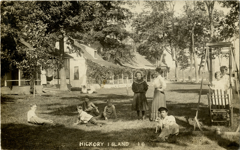 View of a man, women and children posing on lawn at Hickory Island, Michigan. Two children pose on swing; wooden-frame house in background. Printed on front: "Hickory Island." Handwritten on back: "Detroit, Dec. 3. Dear Helene, You [undecipherable] was pleased to hear from you think of you at least every Monday. My mouth has been waiting for a mince pie. Hope your busy time is over wish you had the job I have had for past 3 weeks. I am all alone and I don't like it. Still I am not of aid you know what happened [undecipherable] weeks ago. I received card of the [undecipherable] ask [undecipherable] was hope she and all are well. Yours, C.S." Card is postmarked December 1909.