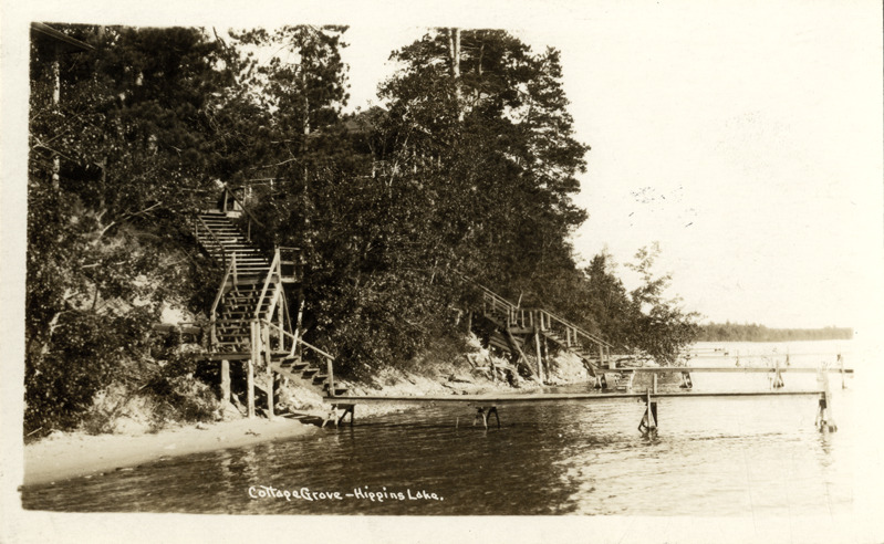 View of stairs on hillside leading to docks on Higgins Lake, in the Cottage Grove neighborhood of Higgins Lake, Michigan. Printed on front: "Cottage Grove, Higgins Lake."