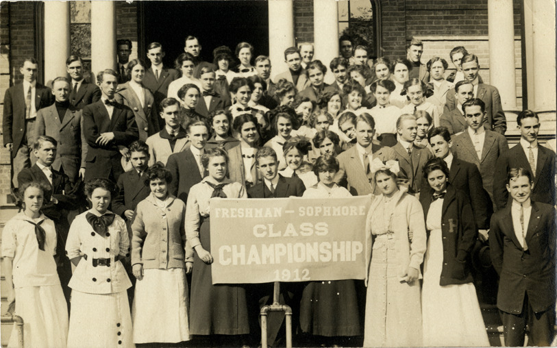 Favorite this☆ Class portrait, Hillsdale, Michigan Description: View of young men and women posing for a class portrait in Hillsdale, Michigan. Several students hold sign that reads: "Freshman, sophmore [sic] class championship, 1912." Details Resource ID: bh014647 Subject: Students--Michigan--Hillsdale Portraits, Group Photographic prints Postcards Date Issued: 1912 Format: 1 postcard ; 3.5 x 5.5 in. Member of: Burton Historical Collection Filing Location: M/Localities-Hillsdale Rights: Physical rights are retained by DPL. Copyright is retained in accordance with U.S. copyright laws.