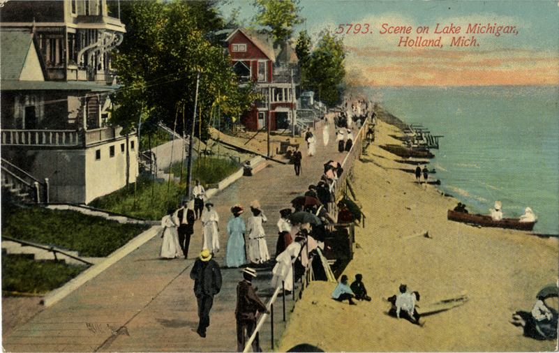 View of pedestrians on Lake Michigan boardwalk in Holland, Michigan. Houses on left. Printed on front: "5793. Scene on Lake Michigan. Holland, Mich." Printed on back: "Pub. by H. Van Tongeren."