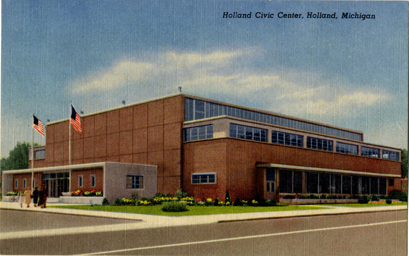 View of the Holland Civic Center in Holland, Michigan. Printed on front: "Holland Civic Center, Holland, Michigan." Printed on back: "Distributed by Nelis Tulip Farm, Holland, Mich. Genuine Curteich-Chicago 'C.T. Art-Colortone' post card (reg. U.S. Pat. Off.)"